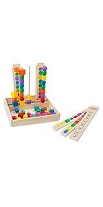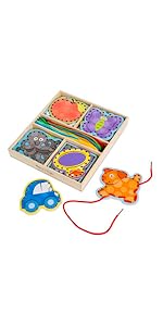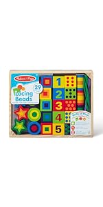 Thirty wooden beads in six vibrant colors and five distinct shapes combine with two extra-long laces to kick off many creative activities. Stringing the easily grasped beads promotes hand-eye coordination as well as fine motor, cognitive, and visual perception skills. This Melissa & Doug beads and laces set allows adults and children to explore multiple playing activities. Parents can ask their child to sort the beads by color, identify each color of bead for the child, and repeat the activity until the child can identify all of the colors independently. Parents can also encourage kids to develop counting skills by asking their child to count the number of beads in each color along with them, repeating the activity until the child has mastered counting one group of beads. The Primary Lacing Beads set makes an exceptional gift for kids from 3 to 5 years. Add the Melissa & Doug Lace & Trace activity set to round out the hands-on play experience and give kids another engaging option for screen-free fun. For more than 30 years, Melissa & Doug has created beautifully designed imagination- and creativity-sparking products that NBC News called “the gold standard in early childhood play.” Today, Melissa & Doug is proudly partnering with the American Academy of Pediatrics to foster early brain development and help children build important life skills through play.