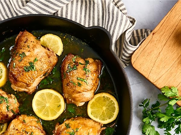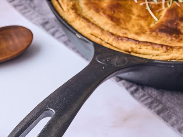 • MADE FOR GREAT MEALS: Our Cast Iron Skillet was designed with the user in mind. It features a thicker edge, a deep vessel for sauces or larger food items, drip-free spouts on each side, and our signature long curved handle for a better grip.