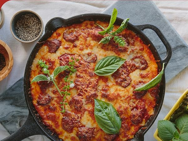 • CAST IRON COOKING: Our cast-iron pan comes has a textured preseasoned skin for an easier release that builds seasoning with each use. We use only non-GMO, kosher-certified flaxseed oil to season it, and it’s PTFE- and PFOA-free for healthier cooking.