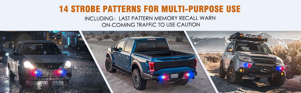 STROBE PATTERNS: The strobe lights for trucks have 14 different flashing modes, such as left to right, right to left, up and down, rotation, etc. The police lights for cars also have a memory call mode. (Make sure to synchronize them before final installation)