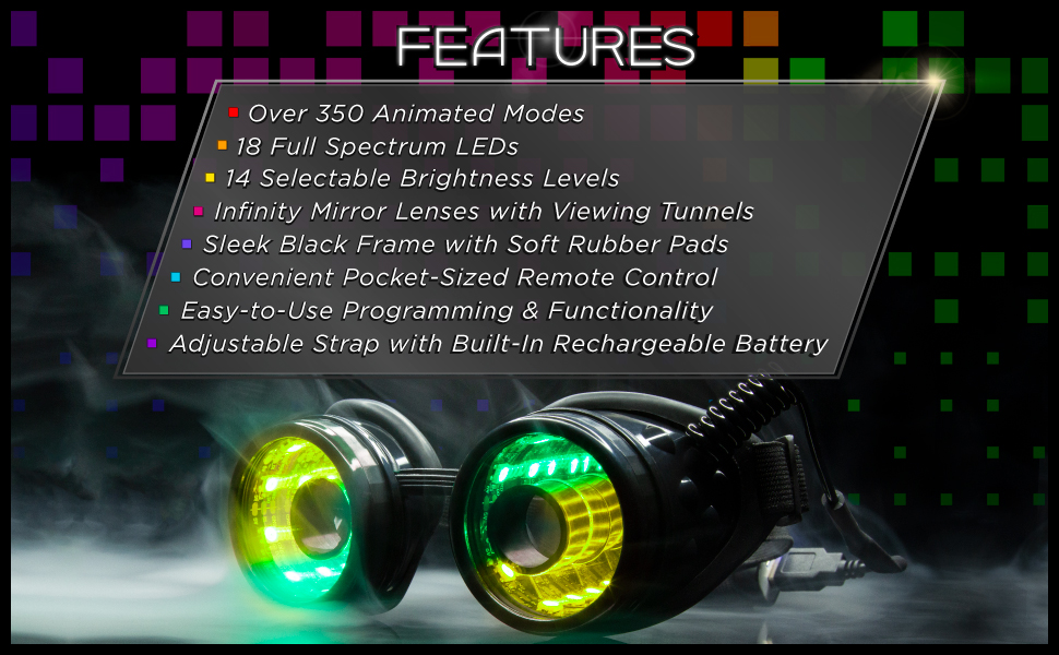 • FULL COLOR SPECTRUM: Elevate your presence with a staggering array of 350 mind-blowing modes. From solid colors to mesmerizing strobing effects and dynamic animations, these rave goggles guarantee an unforgettable experience at raves, EDM shows, concerts, festivals, or any vibrant event. Be the center of attention as you switch between modes.