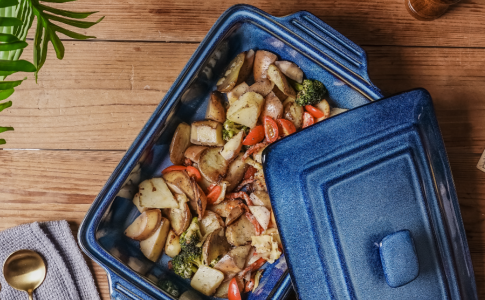 ARTISTIC REACTIVE GLAZE: This stoneware baking dish with lid features unique reactive glaze color for enjoyable baking time. Remarkable display can be a charming decoration even an artwork in your dining table and kitchen.