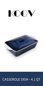 GOOD SIZE FOR DAILY USE: The KOOV rectangular baking dish for oven with lid measures approximately ( excludes the ears' size and lip' size): 13"L x 9"W x 3"H, suitable for lasagna, spaghetti, chicken, meat, beef, roasting, vegetables, storing and reheating leftovers and etc.