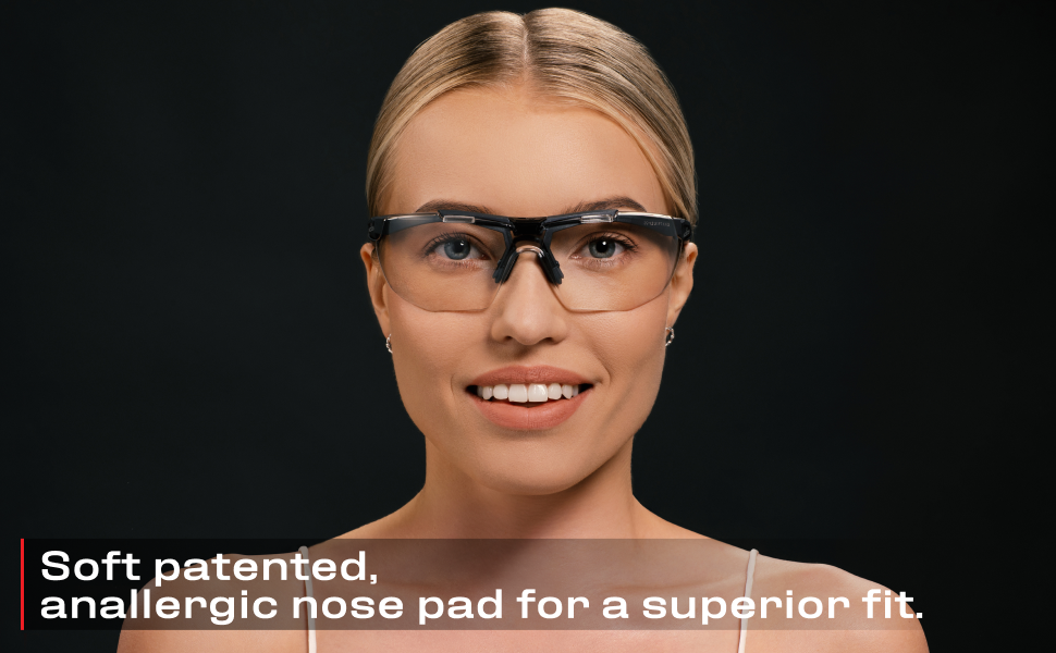 Say goodbye to painful “nose marks” with this patented, adjustable nose pad. You can angle the soft anallergic rubber to reduce the pressure until you barely feel your glasses.