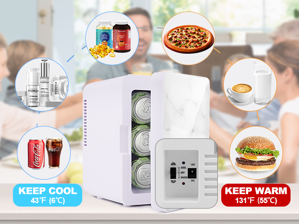 4L Mini Fridge - The small refrigerator has a cooler and warmer mode, cold setting cools to 40° F / 4° C or 32° F / 18° C below ambient room temperature; the warm setting maintains the temperature at 131° F / 55° C.