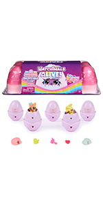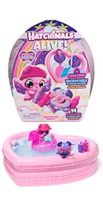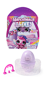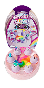 Hatch a carton of characters with the Hatchimals Alive Rainbow Splash Carton. With your love and care, these playful Hatchimals come to life in a colorful new way: eggs that hatch in water, changing the water’s color to match the character. Open the sparkly lid to discover a built-in hatch zone and 5 Hatchimals eggs containing 5 characters, each inspired by the colors of the sunset. Before hatching, choose a spot that’s easy to clean and protect your play area. Set an egg in the hatch zone and remove the wings, then fill the area with water. In seconds, the water changes color as your new friend starts revealing itself, cracking through the egg. Once all 5 super cute characters have been revealed, attach their wings, and use the 5 nurturing accessories (swaddle blanket, rubber ducky, rattle and more) to add to your imaginative storytelling. Dry the carton and display the characters inside or take the carton on-the-go. Those who enjoy action figures, small toys, dolls, and doll house play will love Hatchimals surprise toys. Fun birthday gifts, Christmas gifts and stocking stuffers or gifts for any occasion. Experience a splash of color with the Hatchimals Alive Rainbow Splash Carton.