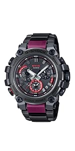 メタルバンドにファインレジンパーツを組み合わせ、重厚感と装着感を両立。MIM(金属粉末射出成形)によるメタルパーツの中空化で、従来比(MTG-B1000D)約15%の軽量化を実現した。また、バンド着脱が簡単にできるダブルスライドレバー構造を採用。
