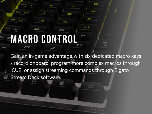 Six Dedicated Macro Keys: Activate functions, shortcuts, or keypresses in just one stroke with six dedicated macro keys, easily set up through CORSAIR iCUE software or use Elgato Stream Deck software