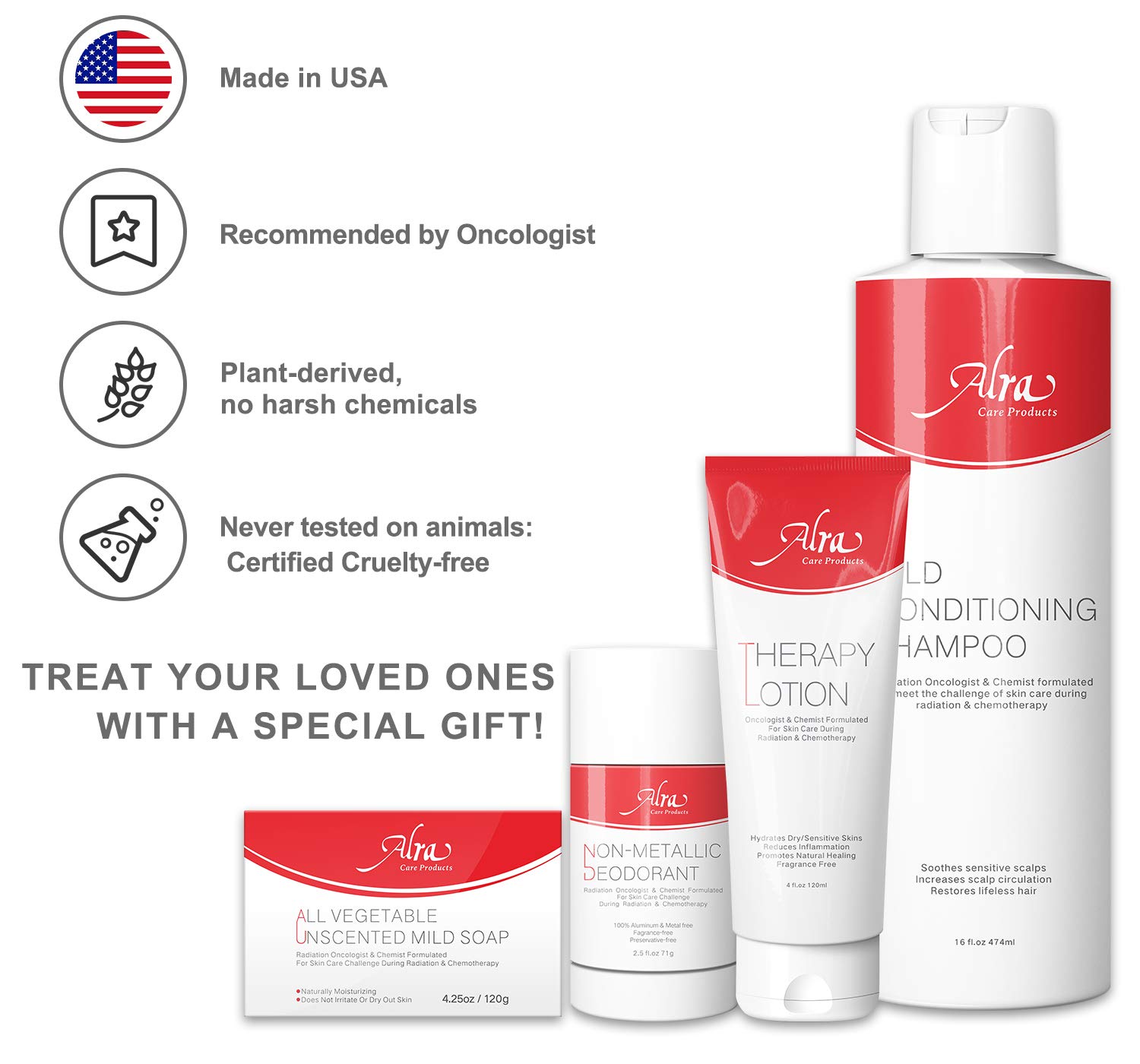 • Tis the holiday season! Treat your loved ones undergoing cancer treatment with a special gift - the Alra Care Chemo Kit! Post Chemotherapy & Radiation Toiletries – This bundle contains therapy lotion for moisturizing dry, irritated skin, soothing unscented soap for a soft cleanse, a mild conditioning shampoo for your hair, and non-metallic deodorant for odor protection.