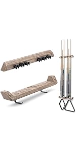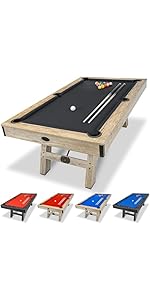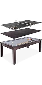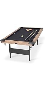 | Key Features | Holds up to 6 pool cues of any size and features 2 bottom hooks to hang 8 ball or 9 ball racks (racks not included). | Premium chalk ensures a smooth application for an even coating to resist caking and flaking on the cue tips. Choose from black, blue, red, or green cue stick chalk to match your billiards table felt for a clean look. | Waterproof and tearproof to protect your table & felt against spills, kids, pet claws and hair, dust, sunlight, and more. | Large, durable table is perfect as a permanent game room fixture to entertain friends and family. Foldable design also means you can instantly store any time as needed or even play outdoor games (always store indoors). | Heavy-duty, mid-size pool table measures 7ft x 4 ft x 2.7 ft. Full set includes 7 ft table, 2 (57 in.) cue sticks, 15 regulation pool balls and cue ball, ball rack, felt brush and chalk. | Upgrade any game room, basement, or family room with exciting games of pool & table tennis, and a convertible dining table top (use with your own chairs or benches). Set includes complete billiards and table tennis accessories for 2 players |