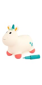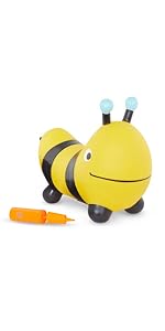 -Inflatable bee bouncer with included pump -Soft, colorful design with grippy antennae -Ideal size for toddler balance and movement -Develops motor skills through active bouncing -Ready to bounce in minutes