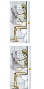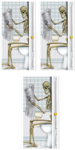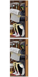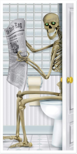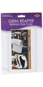 Bring a mix of humor and spookiness to your Halloween decor with the Beistle Skeleton Restroom Door Cover. This fun and eerie decoration features a detailed image of a skeleton sitting on a toilet, adding a touch of whimsy to any haunted house, Halloween party, or themed event. Measuring 30 inches wide by 5 feet tall, it fits most standard doors, making it a great way to cleverly indicate the bathroom location without having to tell your guests. Crafted from lightweight, thin plastic, this door cover is easy to hang and can be used indoors or in covered outdoor areas. Whether you're setting up a haunted house or looking to make your guests laugh, the Beistle Skeleton Restroom Door Cover is an easy and effective way to elevate your Halloween decorations.