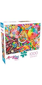 This 1000-piece 26.75 x 19.75 inch interlocking jigsaw puzzle for ages 14+ by Buffalo Games, Merry Mushroom Cottage, is based on the artwork of Aimee Stewart. This image features a magical dwelling, seemingly built into a giant tree, with curving bookshelves mingling with mushrooms growing out of the walls. There are crystals everywhere and a mouse curling up on a chez lounge. Outside the window is a fantastic landscape with similar buildings. Aimee Stewart is a self-taught artist who specializes in lush, electric digital painting and photo-manipulation. Heavily inspired by music and literature, Stewart works from the heart to bring her unique visions to life. Every Buffalo Games jigsaw puzzle is manufactured from recycled puzzle board. A precision cutting technique guarantees that every piece will fit soundly with the company's signature Perfect Snap™. A bonus puzzle poster is also included so that you have a handy reference of what the completed puzzle should look like while you put yours together.