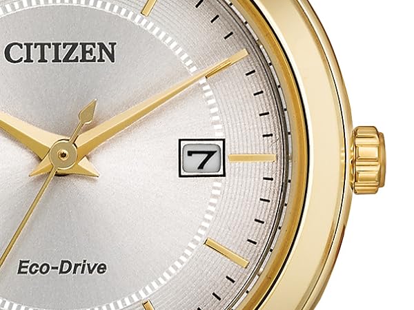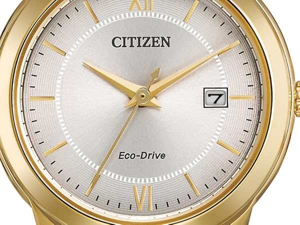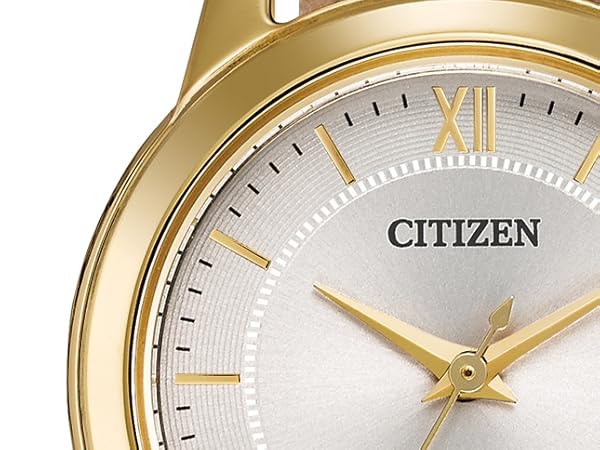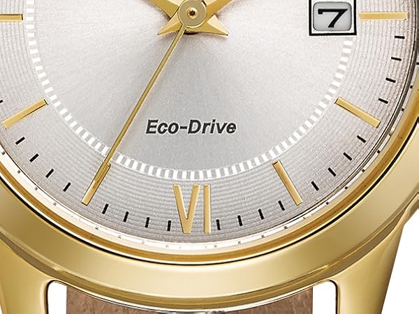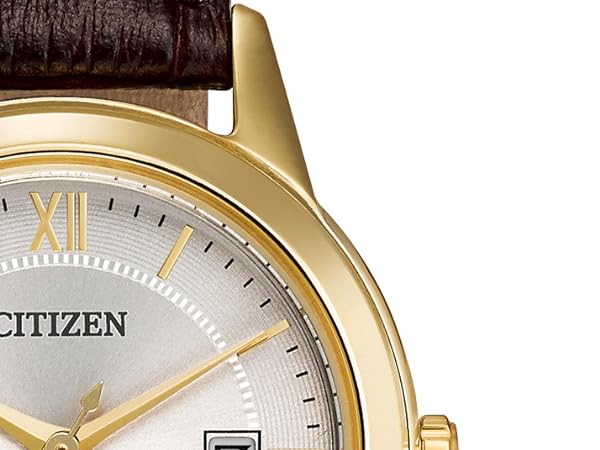 Keep it simple with the classic lines and rich leather strap of these ladies CITIZEN strap watches. Featured with gold-tone stainless steel case, brown leather strap, ivory dial with gold-tone accents and date. Featuring our Eco-Drive technology – powered by light, any light. Never needs a battery. Caliber number J710.
