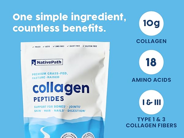 HYDROLYZED TYPE 1 & 3 COLLAGEN: NativePath hydrolyzed Type 1 & 3 collagen, the two most abundant fibers in the body, may support joint flexibility and bone strength.