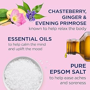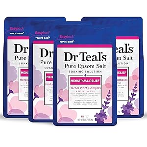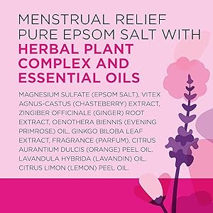 Dr Teal's Menstrual Relief Soaking Solution combines Pure Epsom Salt (Magnesium Sulfate USP) to ease muscle cramps and body aches often related to PMS with essential oils help uplift the mood. A warm bath in combination with magnesium sulfate and the Herbal Plant Complex provides warmth and relaxation. Pure Epsom Salt helps to ease aches and soreness. Our Herbal Plant Complex blend contains ginger, chasteberry, and evening primrose which have long been known to relax the body.