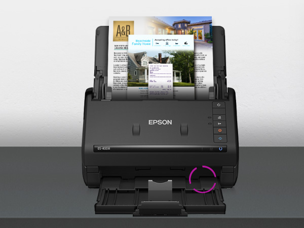 Organize swiftly with the WorkForce ES-400 II 2-sided desktop scanner. This efficient, user-friendly device scans up to 35 pages per minute, Based on letter-sized scans at 300 dpi in Black-and-White, Grayscale or Color Mode., capturing both sides at once. Its 50-sheet Auto Document Feeder handles various document sizes with ease. With Epson ScanSmart Software you can preview, email, and upload scans effortlessly. The included TWAIN driver ensures compatibility with most document management software. Scan directly to cloud storage or searchable PDFs. Adjust colors and images easily with features like auto crop, blank page skip, background removal, dirt detection and paper-skew correction, ensuring excellent scan quality every time.