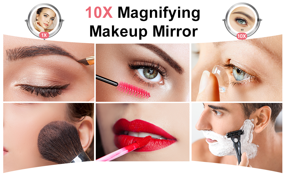 【DOUBLE SIDED MAGNIFYING MAKEUP MIRROR】- The dual sided 10x and 1x mirrors provide a wide-angle viewing for you to see clearly your facial features and make a more perfect makeup with each detail taken care of. This magnified mirror enables you to see every detail of your beauty and help you look more gorgeous every day