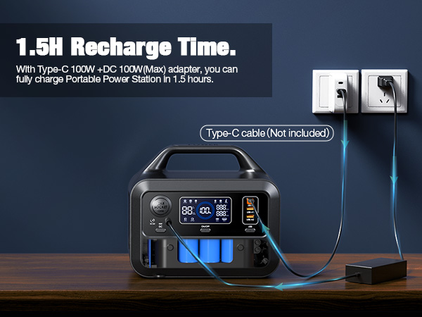 【Four Recharging Modes】 300W portable rechargeable power station with Four methods to charge the portable power station. 1. you can fully charge the power supply via AC outlet with 2.5-4.5 hours. 2. it can be charged under the sun with a solar panel(12V-24V, 2.5A). 3. The power station can be charged by 12V socket of the car and car charger efficiently. 4.It can fully charge the power station in 1.5hours by Type-C 100W Input(not included)+DC 100W Input.