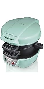 Forget the fast food drive-through. With the Hamilton Beach Breakfast Sandwich Maker, you can enjoy a hot, homemade breakfast sandwich in under 5 minutes. Simply place the ingredients inside, build the base of your sandwich in the bottom layer, place the egg on the cooking plate and close the lid. Slide the cooking plate out and your sandwich assembles itself. Open the lid and your hot breakfast sandwich is ready to eat. The included recipe book provides a variety of breakfast sandwich options, from the traditional egg, ham and cheese to the unique cheddar, apple, bacon and egg croissant sandwich.