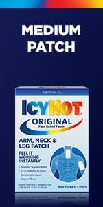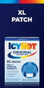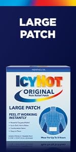 Get aches and pains under control with easy-to-use Icy Hot Original Pain Relieving Patches with 5% menthol. These extra-large pain patches provide targeted pain relief and can be worn for up to eight hours. Feel the power of Icy Hot's contrast therapy, icy to dull the pain, then hot to relax it away. Icy Hot Pain Patches are easy to apply and comfortably stay in place. Best of all, these medicated pain patches are mess-free. Use Icy Hot XL Pain Relief Patches to help temporarily relieve minor pain associated with simple backache, arthritis, strains, sprains and bruises. This box contains six large pain patches for back pain and other large areas. At the gym, at home or on the job, rely on Icy Hot Medicated Pain Relief Patches for fast acting pain relief. Icy Hot is the No. 1 topical pain relief brand.**Among OTC topical analgesics.HOW TO USE: Remove backing from patch by firmly grasping both ends and gently pulling until backing separates in middle. Apply exposed portion of patch to affected area. Wear one Icy Hot patch up to 8 hours. Repeat if necessary, but no more than 3 to 4 times daily.