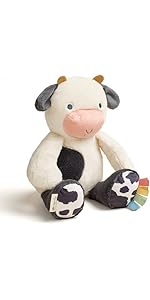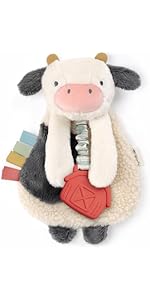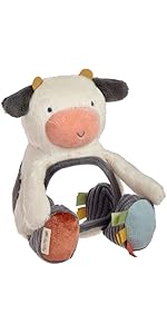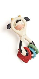 The Itzy Ritzy Spinner Rattle Toy is a playful, multi-sensory teething rattle designed to engage and soothe your little one. Shaped like a cute cow, it features a spinning ball with a gentle rattle sound that encourages sensory and visual development. The interactive twist-and-click body adds movement and tactile fun, helping to build fine motor skills. Soft ears and three textured teether rings provide comfort for sore gums, making it a perfect teething rattle for infants. Lightweight and sized for tiny hands, this baby grasp toy is easy to hold and shake, ideal for at-home play or on the go. Whether for stroller rides or everyday sensory play, it’s a thoughtful baby shower gift that supports early developmental milestones.