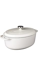 The cast iron vessel has superior heat distribution and retention, evenly heating throughout both the bottom and sidewalls. The tightly fitting lid seals in moisture for scrumptious pot roast, stews or a large batch of beans.