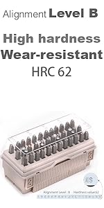 Complete 36-Piece Set with Alignment Tools Includes 36 stamps (A-Z, 0-9, "&"), built-in alignment tools, a durable storage box