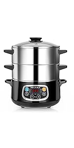 • Stackable 2-tier food steamer baskets for cooking, steam cooker glass lid with the non-slip upper knob, anti-scalding handle, clear water line and LED display.
