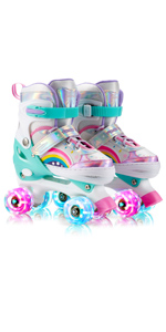 🌈【4 Size Adjustable Roller Skates】-Our roller skates can be adjusted to 4 different sizes to fit different foot lengths. 2 sizes are available: Small-Little Kid/Medium-Big Kid. Easy and convenient one button to adjust the size, find the exact fit! It is a perfect choice for growing children.