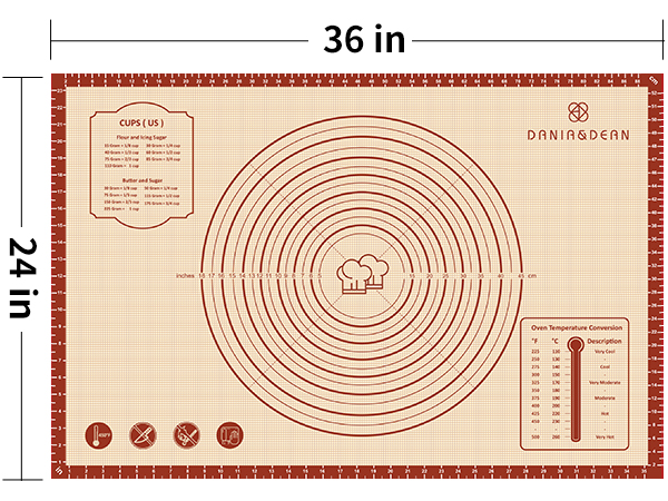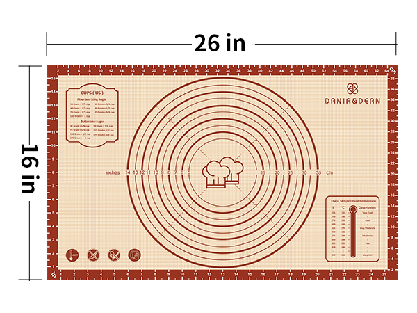 PERFECT for BAKING and PASTRY Mat: This silicone pastry making mat provides a large(26" x 16")non-stick surface for preparing all kinds of pie crust,pizza,dough,biscuit,macarons,bread,pastries and fondant. Perfect size for baking,measured with imperial and metric cooking sheet,which can guide everyone easy to bake,even the one who has no experience.Using this baking silicone mat,you will save a lot of work. EASY to CLEAN & STOR