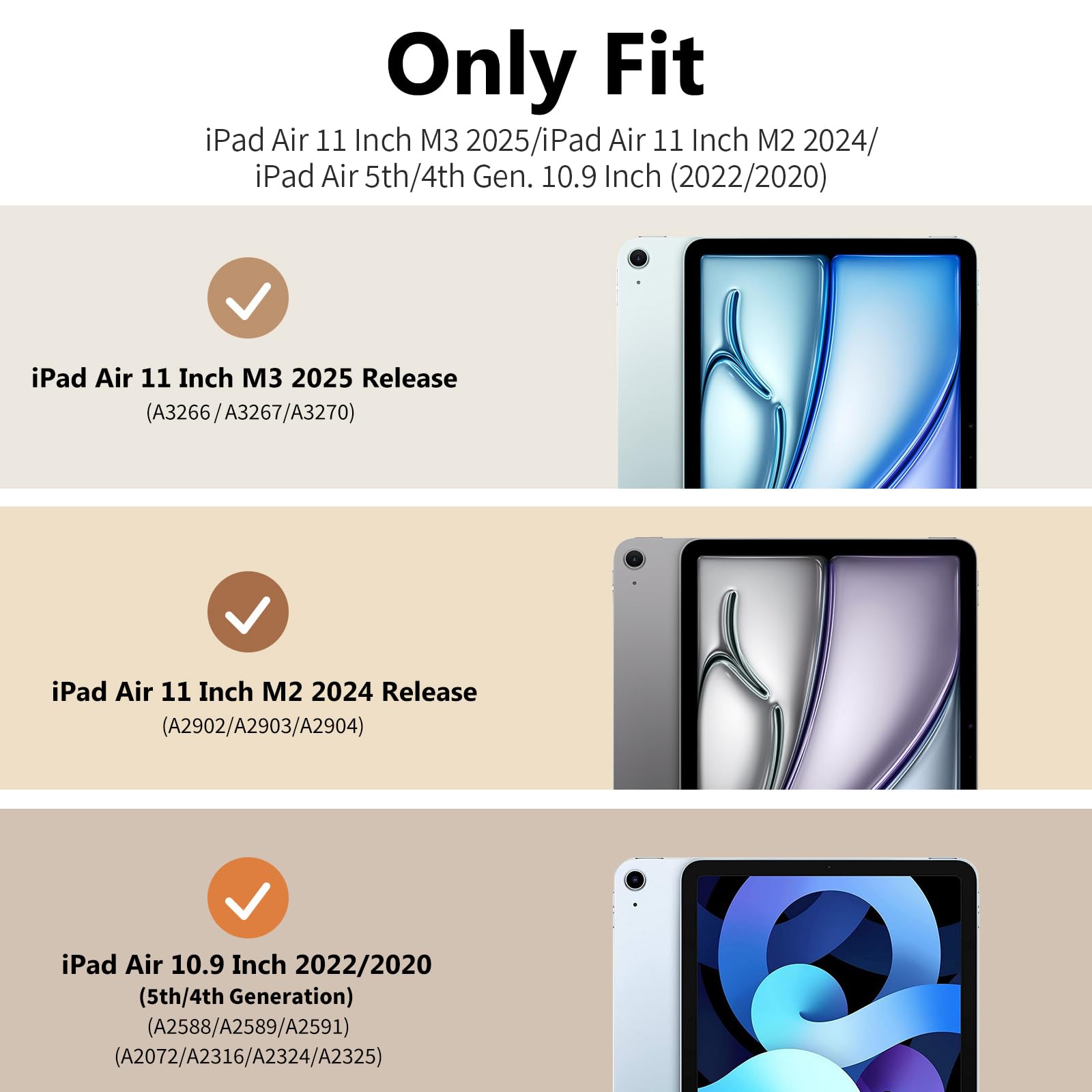 • Perfect Compatibility: Preciously designed for iPad Air 11 inch (M3/M2) 2025/2024 (Model number: A3266/A3267/A3270/A2902/A2903/A2904), iPad Air 5th/4th Generation 2022/2020 (Model number: A2588/A2589/A2591/A2072/A2316/A2324/A2325). Please check the back bottom of your ipad to find the model number