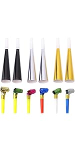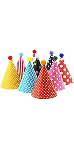 Party Hats include 9 assorted paper cone hats with pom poms AND 2 crowns(silver and gold crowns).